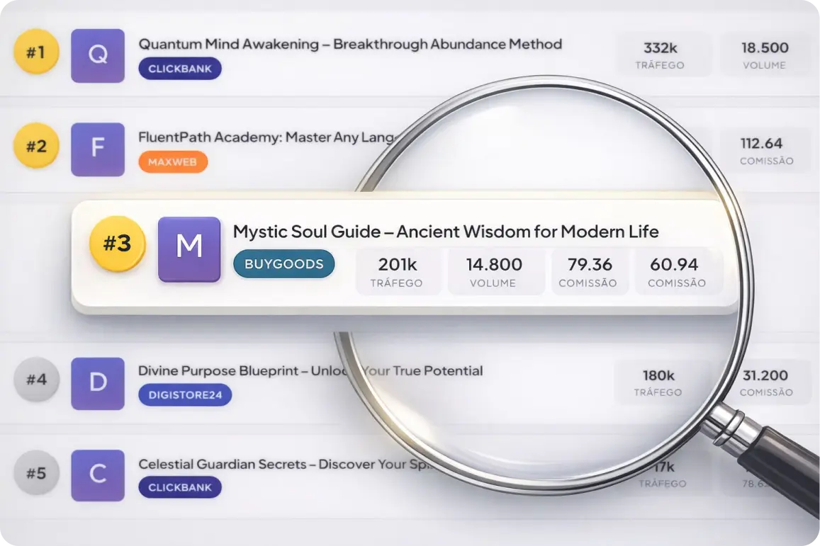 Nossa IA varre Clickbank, Digistore, Buy Goods e diversas outras plataformas 24 horas por dia, 7 dias por semana, buscando por produtos com alto potencial de lucro e baixa concorrência.